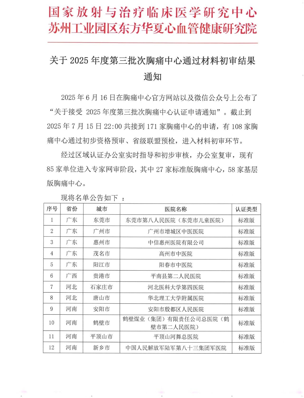 重要通知|关于2025年度第三批次胸痛中心通过材料初审结果通知