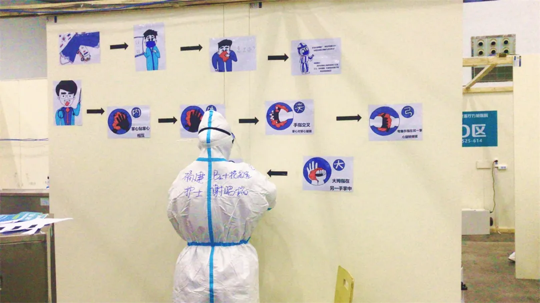“在临床上,健康宣教对于患者病情康复,出院后保持良好的身体和心理状态很重要。”谢昭端说。但是在方舱医院,医护人员都要穿着防护服、带着两层口罩还有面屏,把自己包裹得严严实实,和患者言语交流不是很方便。