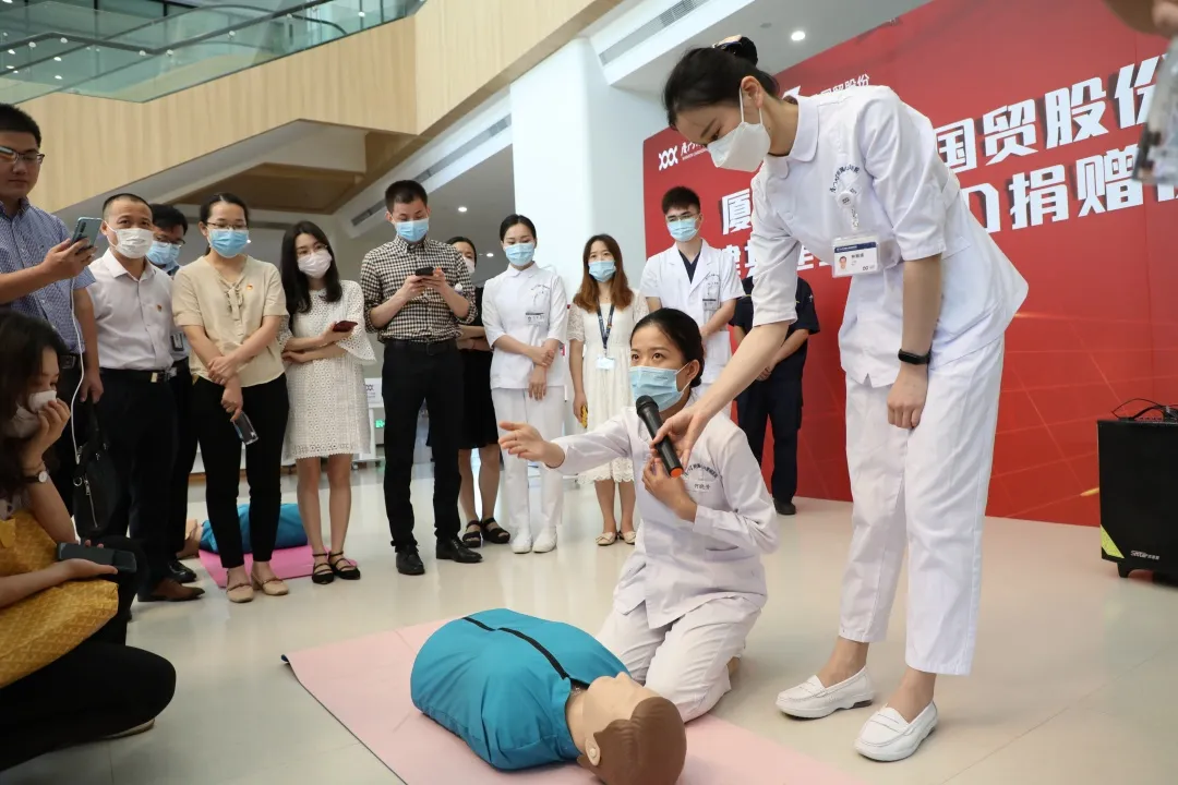 6月29日上午,厦心门诊大厅内,人们屏息凝神,一场现场心肺复苏培训正在这里举行。现场就医的患者和来自厦门国贸集团股份有限公司的党员志愿者近百人认真听取了心肺复苏术(CPR)基本步骤及自动体外心脏除颤器(AED)操作方法的现场讲授,厦心心血管专家深入浅出的讲解、设备操作的实践让参加培训的人员受益匪浅。
