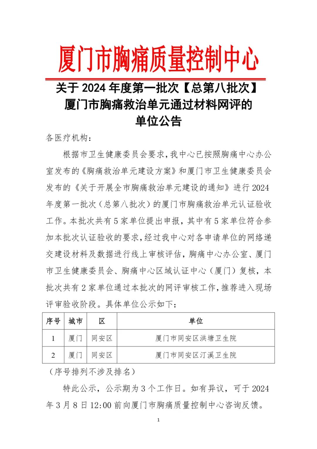 重要通知 | 关于2024年度第一批次(总第八批次)厦门市胸痛救治单元通过材料网评的单位公告