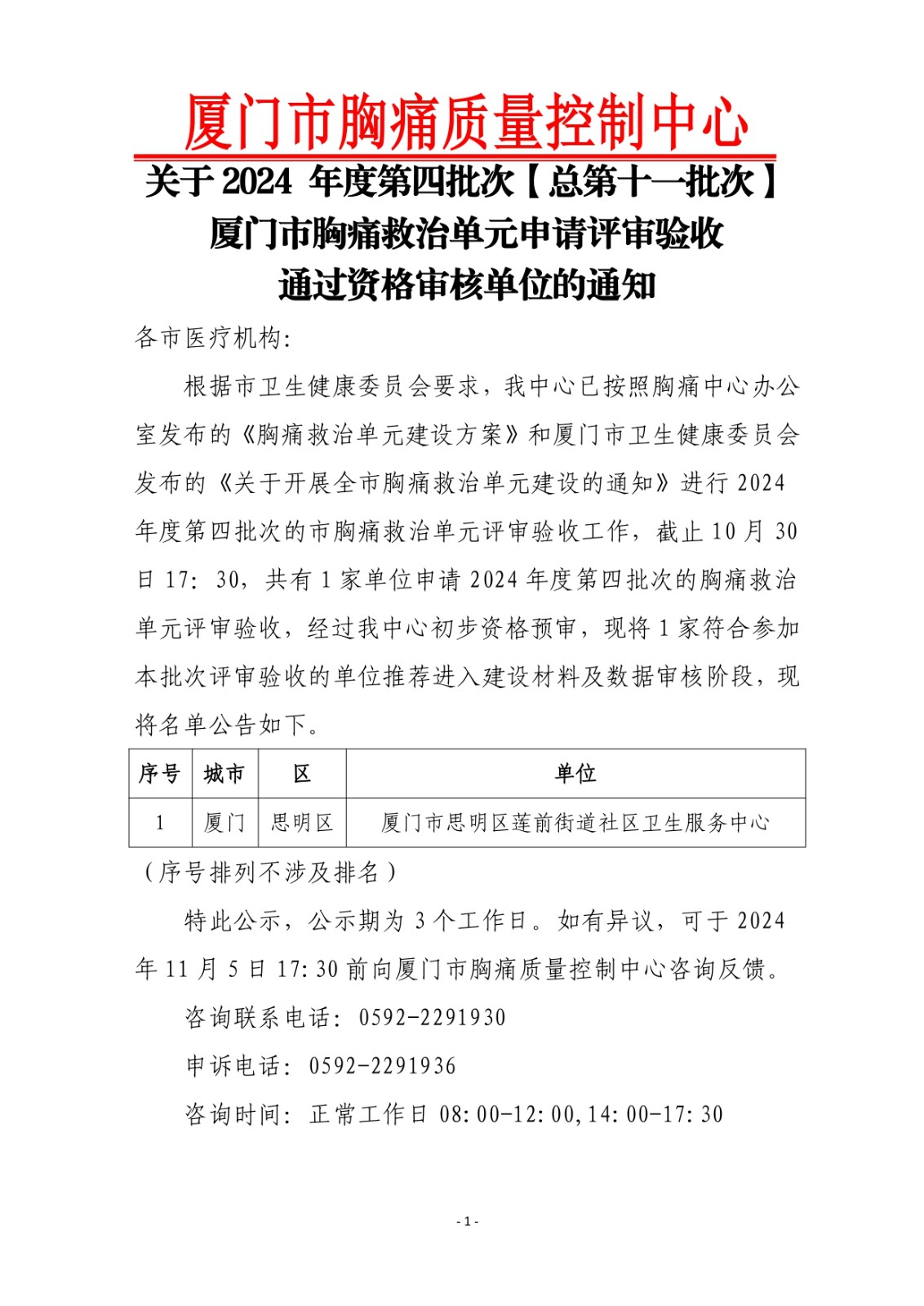 重要通知 | 关于2024年度第四批次(总第十一批次)厦门市胸痛救治单元申请评审验收通过资格审核单位的通知
