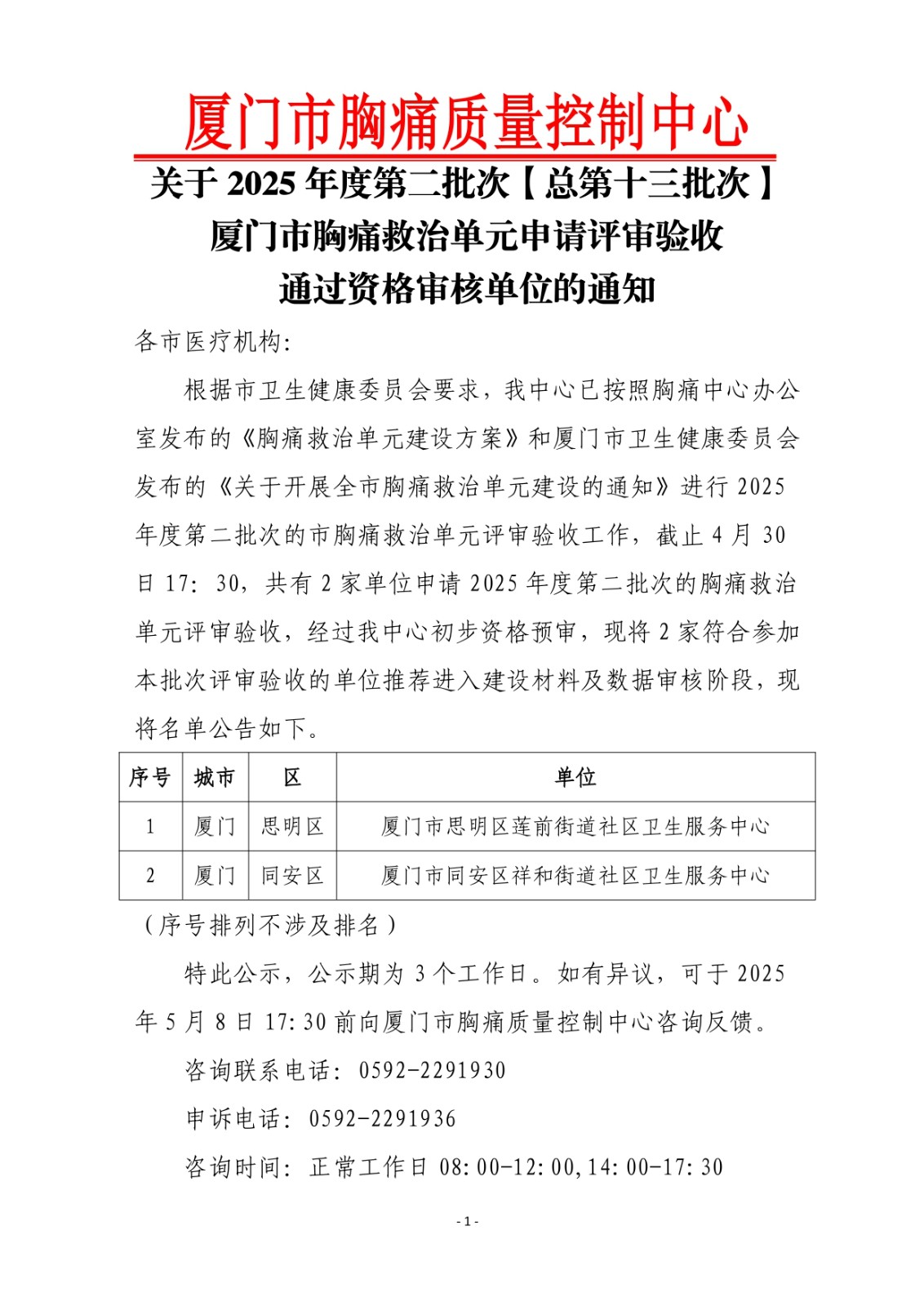 重要通知 | 关于2025年度第二批次(总第十三批次)厦门市胸痛救治单元申请评审验收通过资格审核单位的通知