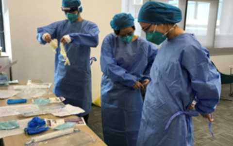 2022-05-10科教部组织在院学生进行一级、二级防护用品穿脱培训及考核 -
